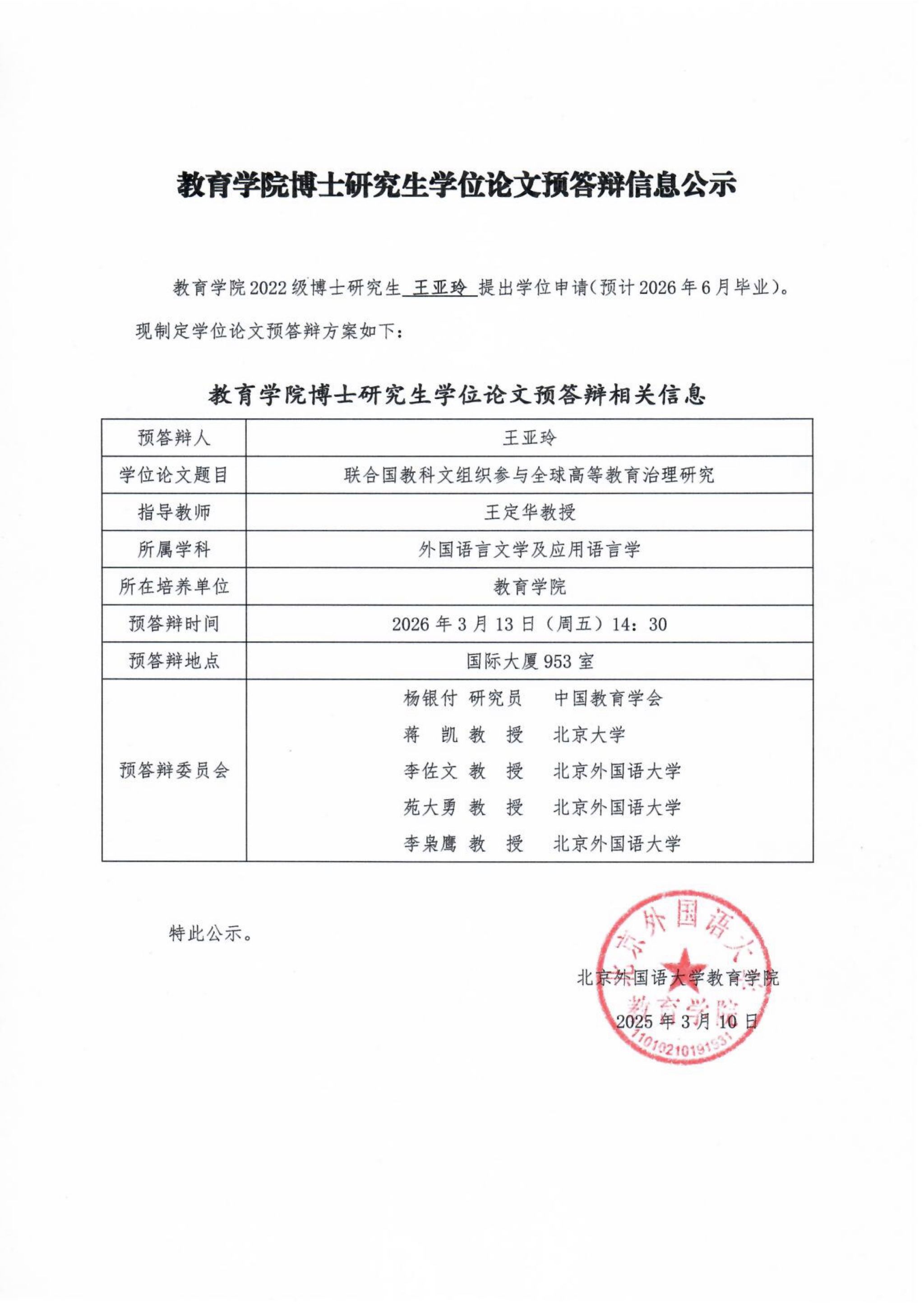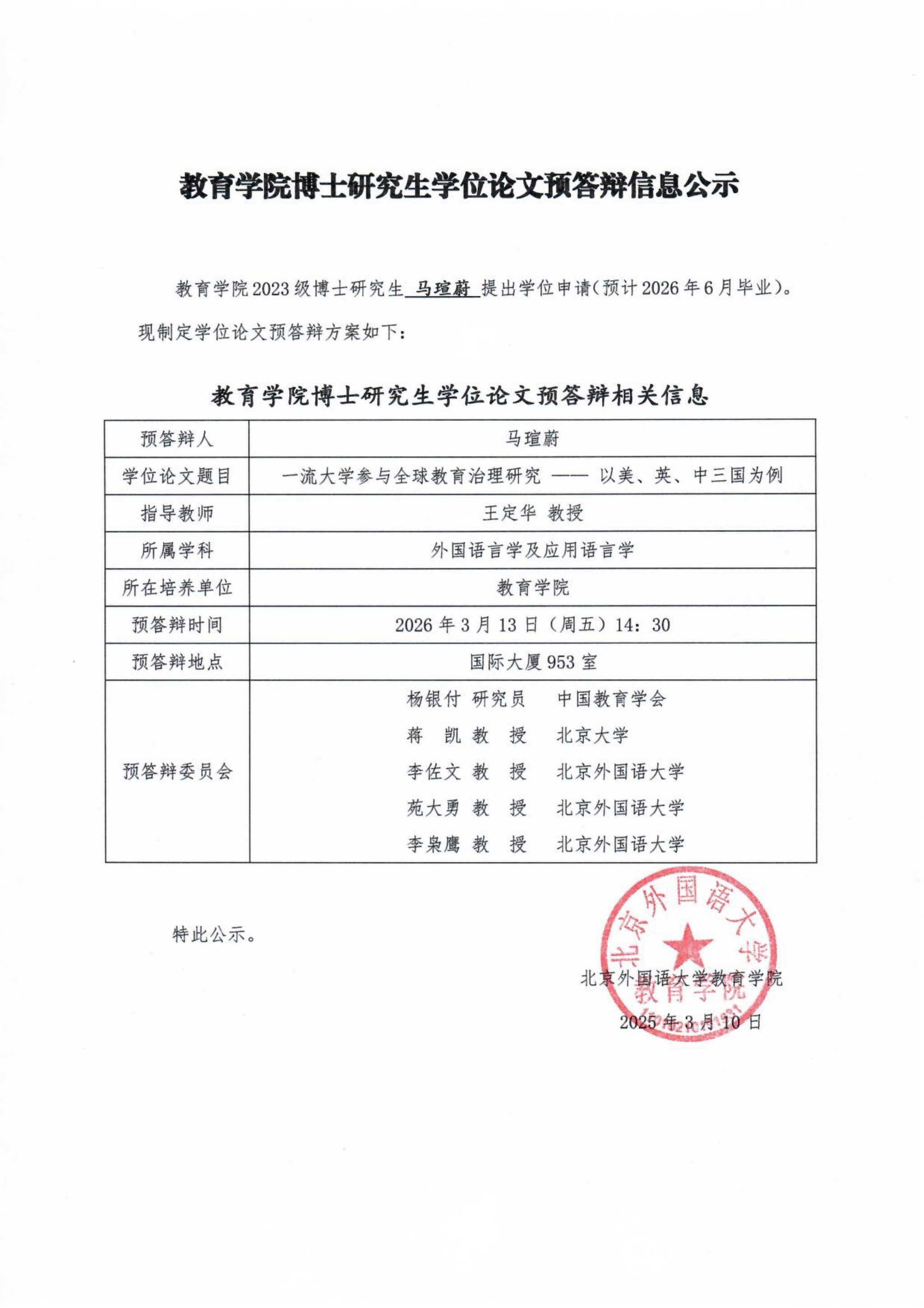 教育学院博士研究生学位论文预答辩信息公示