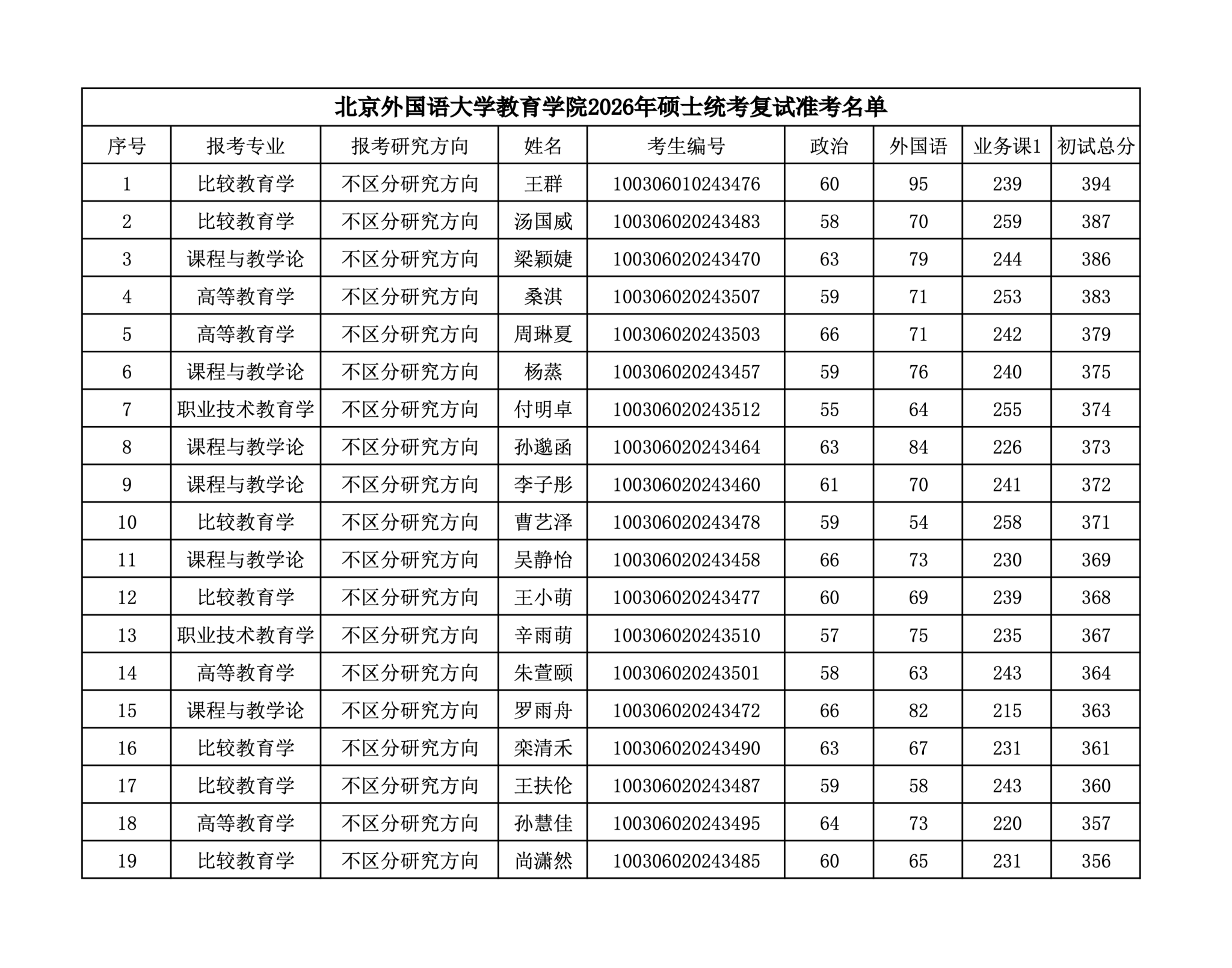 北京外国语大学教育学院2026年硕士统考复试准考名单