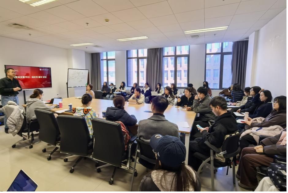 会议伊始,滕岑同志结合教育强国建设的时代背景,对支部思想建设、组织建设和党员表率作用发挥提出要求,并就提炼党建品牌、推动创新发展提出了工作期待。会议第二项议程,开展2025年度组织生活会及民主评议党员工作。全体党员结合自身实际,认真开展批评与自我批评,深入查摆问题、明确整改方向。民主评议环节中,全体党员坚持实事求是、客观公正的原则,对支部党员进行了评议。随后,党支部书记尤铮围绕“树立和践行正确政绩观学习教育”主题讲授微党课,通过导读《习近平关于树立和践行正确政绩观论述摘编》《习近平总书记地方工作期间坚持正确政绩观生动实践》,分享了新时代教育工作者树立正确教育观的收获感悟。会议还部署了二十届四中全会精神的培训工作,明确了学习培训的具体安排、责任分工和时间节点,确保全会精神学习的宣传贯彻工作落实。最后,会议针对“三会一课”规范化开展、主题党日活动创新、党员发展流程优化等常规工作进行交流,进一步明确了工作重点。