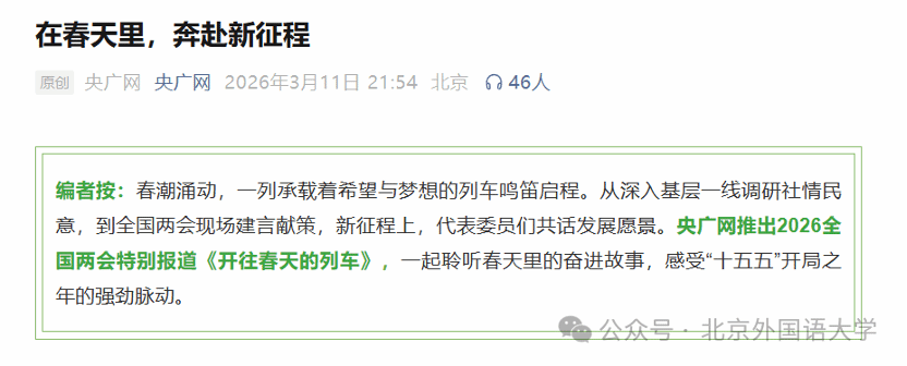 2026全国两会期间,央广网推出特别报道《开往春天的列车》。3月11日全国两会闭幕后,央广网就参会感受专访各界代表委员。王定华委员在采访中强调,新时代教育要着力培养更多有家国情怀、有全球视野、有专业本领的复合型人才。未来要让人才在推动中国更好走向世界、让世界更好了解中国的过程中,发挥更大作用。