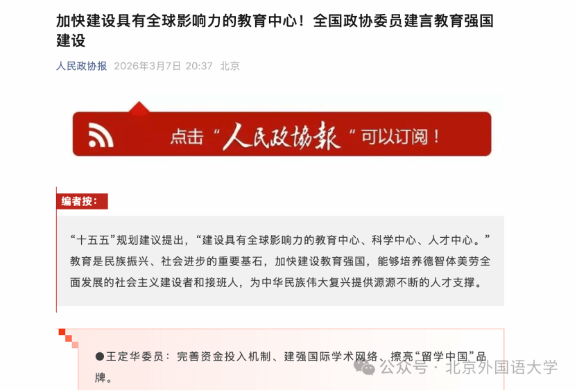 “十五五”规划纲要草案提出,扩大高水平对外开放,开创合作共赢新局面。推动高水平教育对外开放,既是中国教育的责任与使命,也是加快建设教育强国的必然要求。今年全国两会,高水平教育对外开放成了代表委员热议的话题。3月12日,《中国教育报》聚焦 “高水平教育对外开放”推出《写好教育对外开放的“中国答卷”——代表委员热议扩大高水平教育对外开放》专题报道。