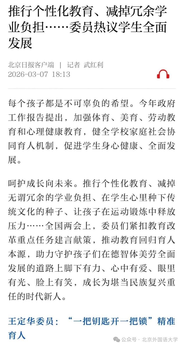 今年政府工作报告提出,加强体育、美育、劳动教育和心理健康教育,健全学校家庭社会协同育人机制,促进学生身心健康、全面发展。3月7日,《北京日报》就促进学生全面发展推出文字报道《推行个性化教育、减掉冗余学业负担……委员热议学生全面发展》。