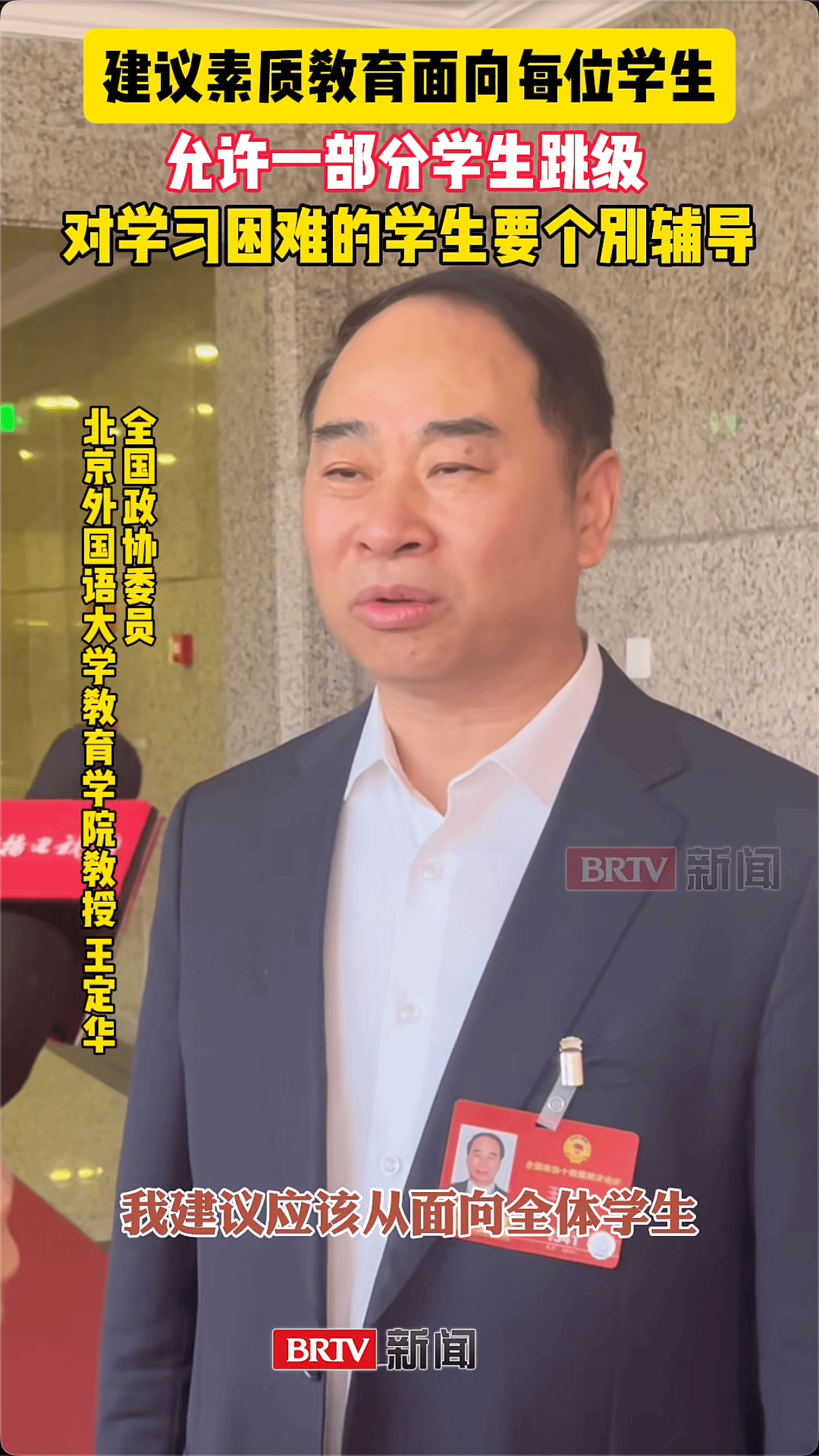 3月6日,王定华委员在接受《北京新闻》栏目采访时强调,素质教育应该从面向全体学生过渡到面向每位学生。对于天资聪颖的学生要允许跳级,对学习有困难的学生要个别辅导,助力每一位学生实现自我成长。