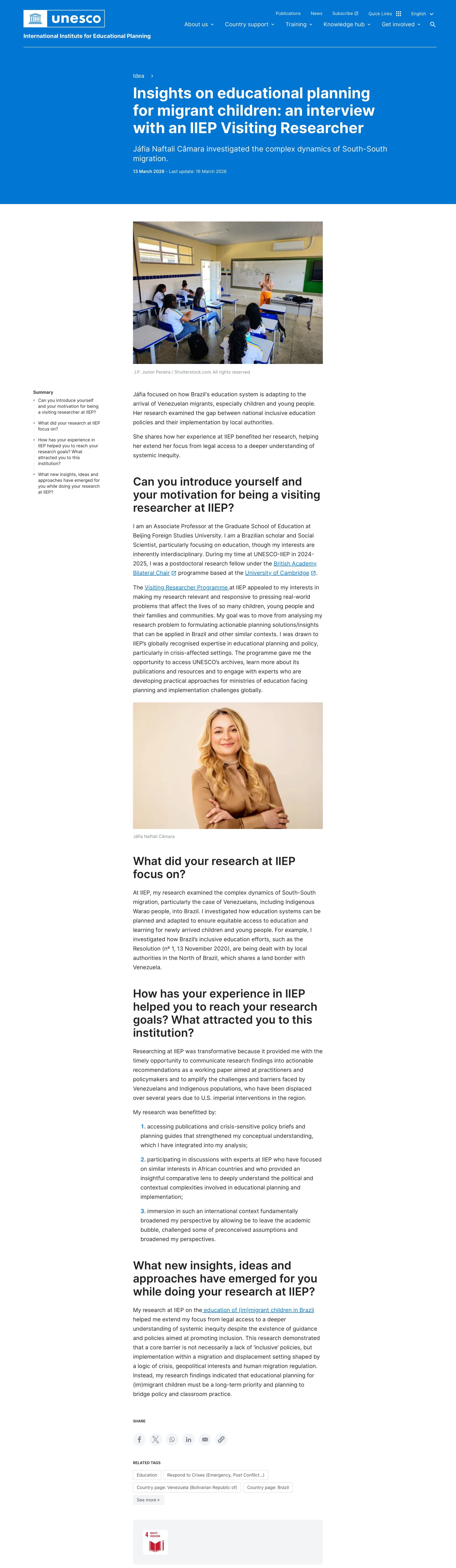 近期,联合国教科文组织国际教育规划研究所(UNESCO-IIEP)官网,以《富有见解的移民儿童教育规划研究:专访IIEP访问研究员》为题,报道了我院副教授贾菲亚·纳夫塔尔·卡马拉(Jáfia Naftali Câmara)在该研究所作为访问研究员期间开展的研究工作。